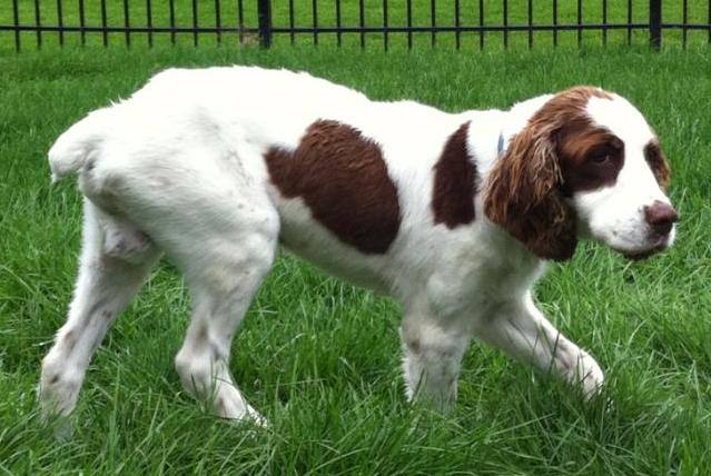 Possible Springer Spaniel or Brittany, intact male, estimating under 1-year-old, wearing baby blue collar, no tag.